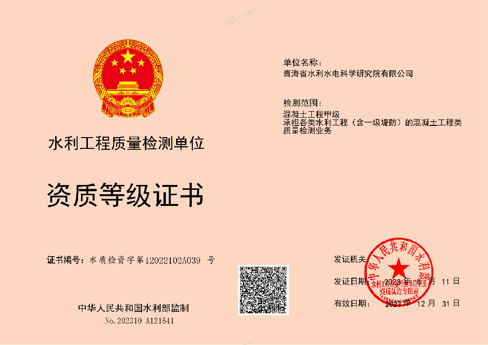 • 水利工程質量檢測單位資質等級證書(混凝土工程類)